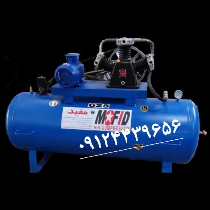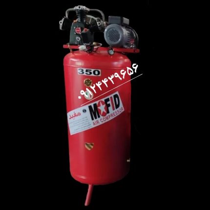 کمپرسور هوا (پمپ باد) 350 لیتری پیستونی مفید میزان هوادهی 390 لیتر فشار باد 8 بار سیلندر 3065 (سه سیلندر قطر 65 میلی متر) ضخامت ورق مخزن 3 میلی متر دینام چینی تمام مس ۳اسب ۳۰۰۰دور رنگ پودری الکترو استاتیک جوشکاری مخزن رباتیک برند مفید