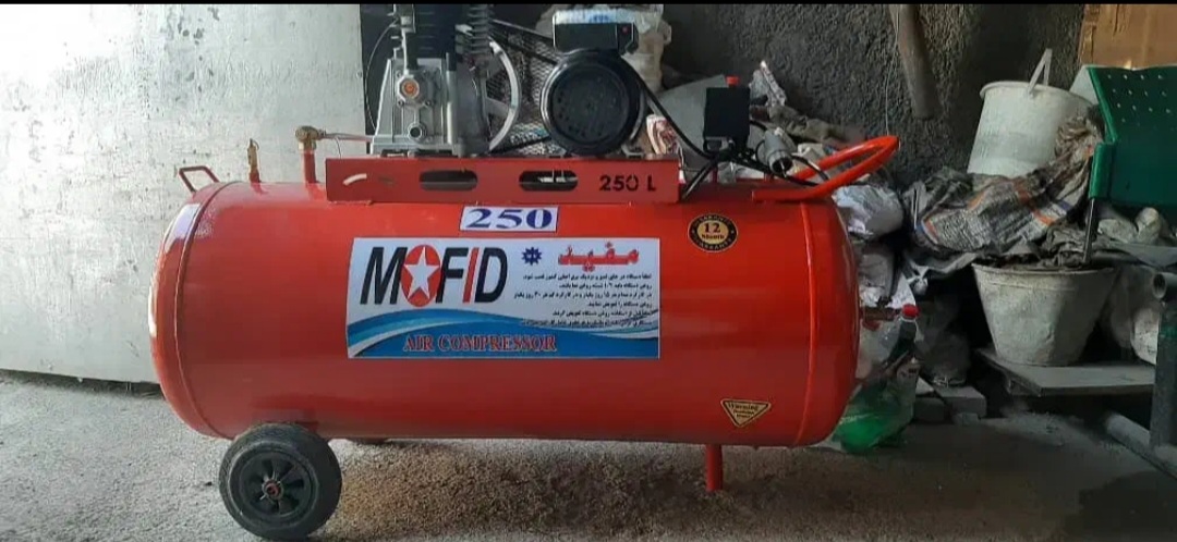 کمپرسور هوا (پمپ باد) 350 لیتری پیستونی مفید میزان هوادهی 390 لیتر فشار باد 8 بار سیلندر 3065 (سه سیلندر قطر 65 میلی متر) ضخامت ورق مخزن 3 میلی متر دینام چینی تمام مس ۳اسب ۳۰۰۰دور رنگ پودری الکترو استاتیک جوشکاری مخزن رباتیک برند مفید