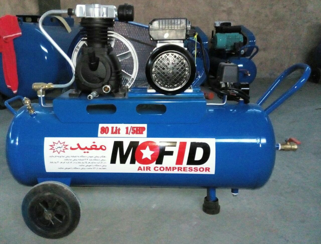 کمپرسور هوا (پمپ باد) 350 لیتری پیستونی مفید میزان هوادهی 390 لیتر فشار باد 8 بار سیلندر 3065 (سه سیلندر قطر 65 میلی متر) ضخامت ورق مخزن 3 میلی متر دینام چینی تمام مس ۳اسب ۳۰۰۰دور رنگ پودری الکترو استاتیک جوشکاری مخزن رباتیک برند مفید